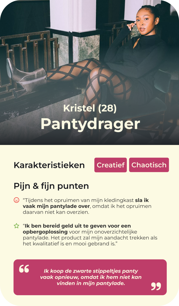 Een opvallend inzicht was dat pantydragers hun panty’s in mandjes oprollen of deze erin proppen. De print is niet goed zichtbaar en er is geen overzicht in de collectie.