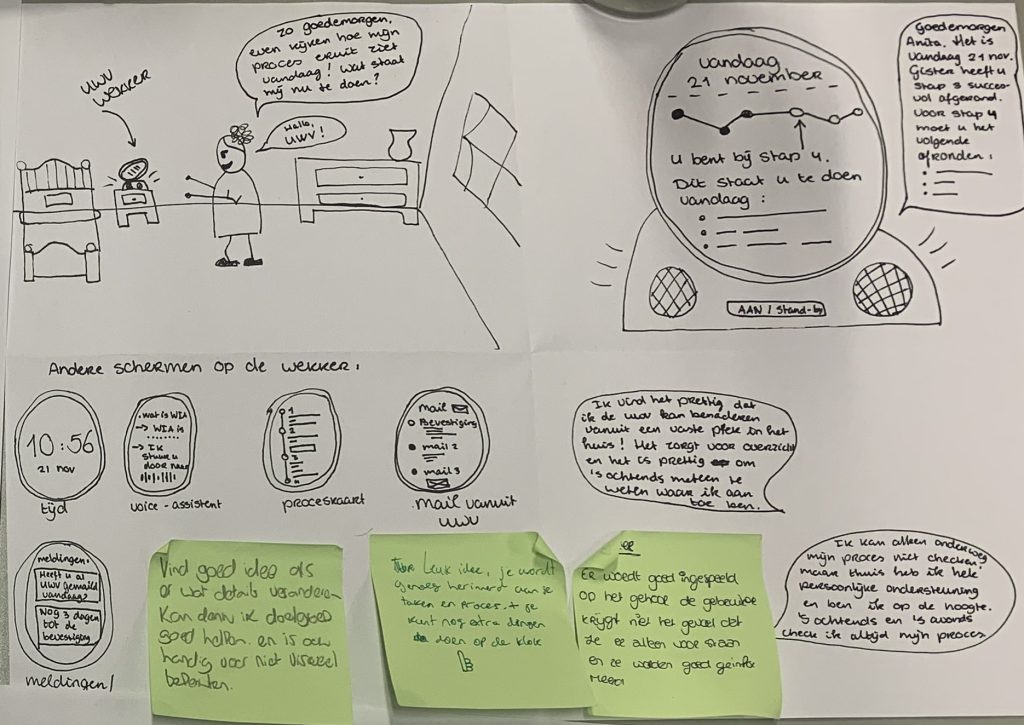 Op de afbeelding hiernaast is mijn creatieve brainstormsessie conceptidee getekend. Mijn out-of-the box idee was een wekker die het aanvraagproces aangeeft, in plaats van dat dit via een app gebeurt.
