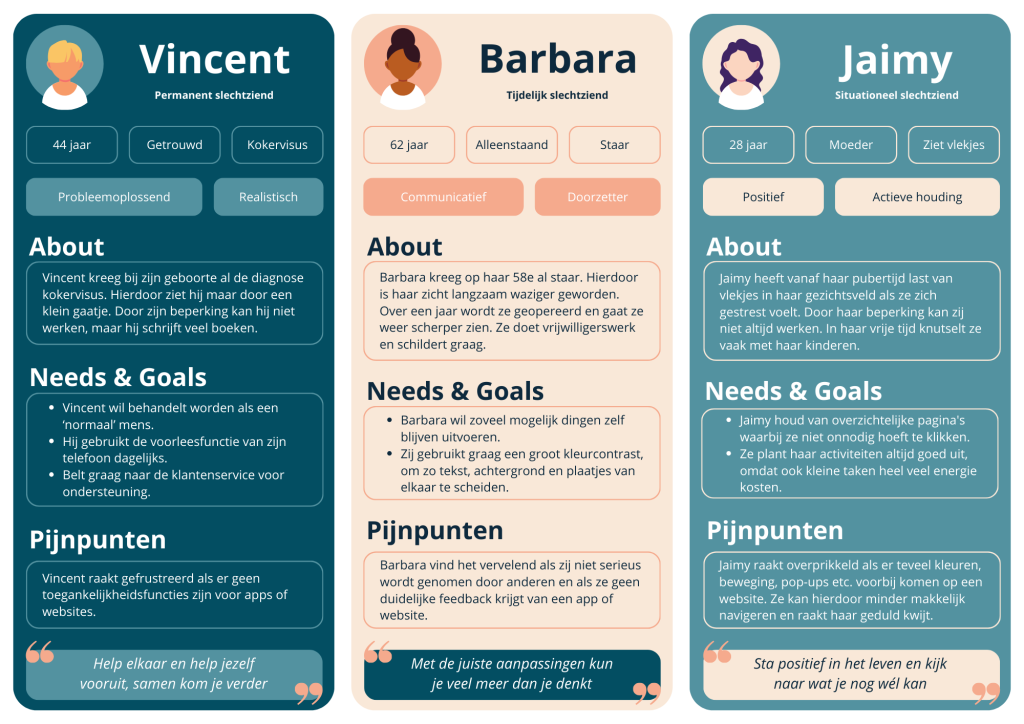 Ik maakte hiervoor met een teamgenoot een moodboard en kozen voor de huisstijl een groenblauwe kleur, omdat dit vertrouwen en vernieuwing uitstraalt. Daarnaast gaf de expert van Visio aan dat deze kleur door bijna elke slechtziende goed te lezen was.