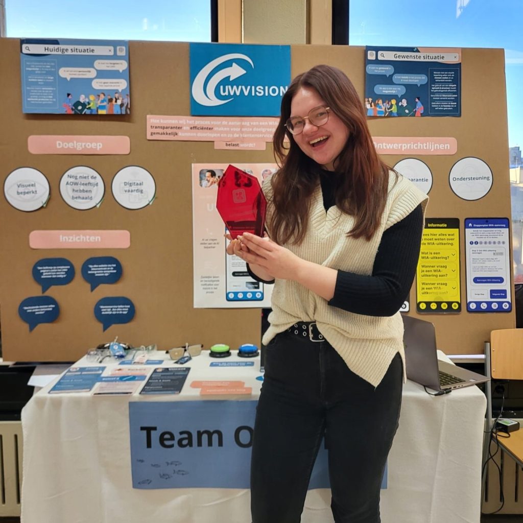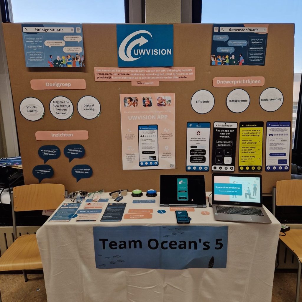 Ik startte met mijn team het project met het doen van deskresearch naar het UWV en verschillende beperkingen. Op basis daarvan kozen we voor het verduidelijken van de WIA-uitkering aanvraag en de doelgroep met een visuele beperking.