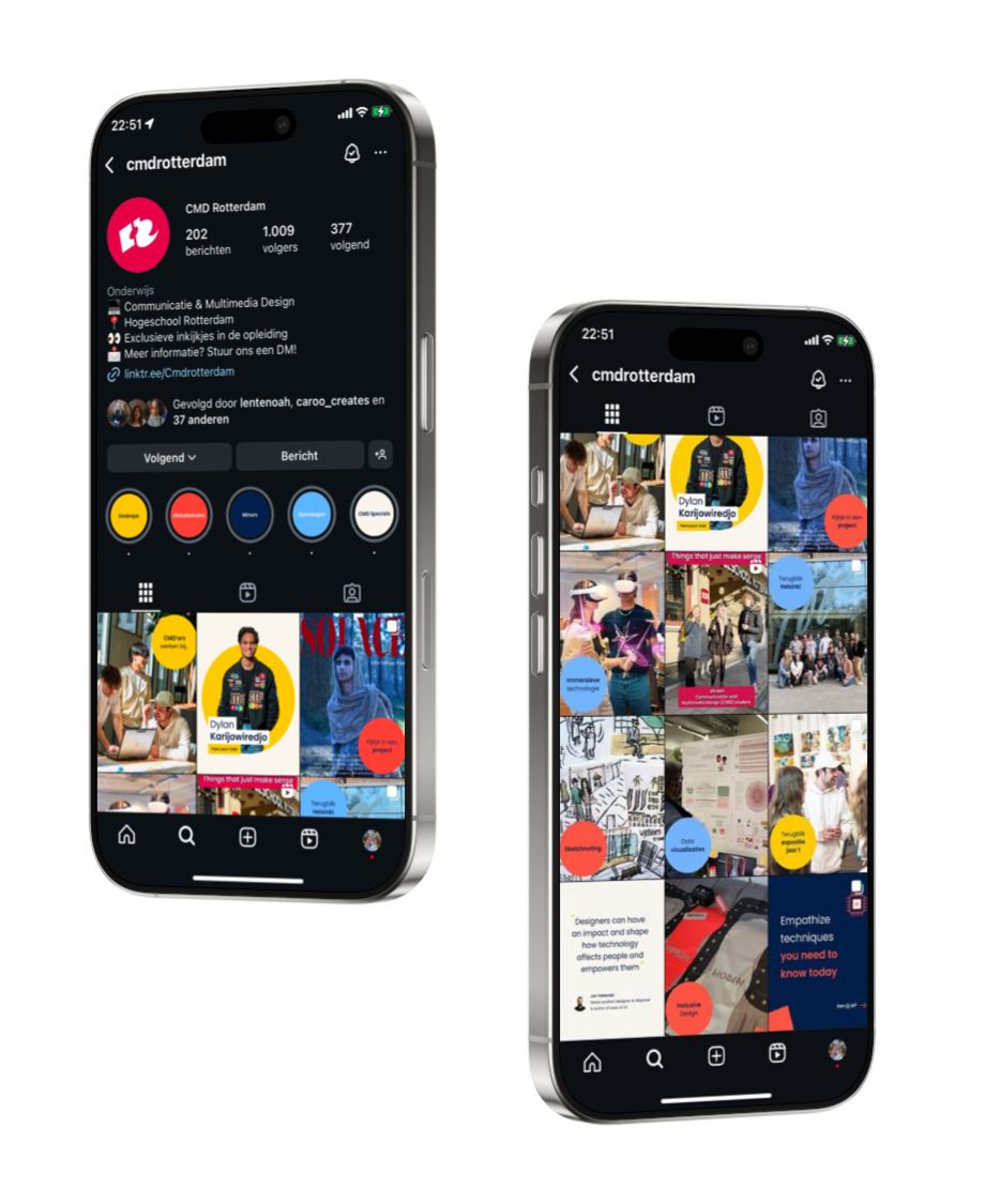 Momenteel ben ik de content creator van de CMD Rotterdam Instagram. Ik bedenk concepten, fotografeer, ontwerp posts en bedenk passende captions. Op die manier hoop ik nieuwe studenten te trekken naar de opleiding!